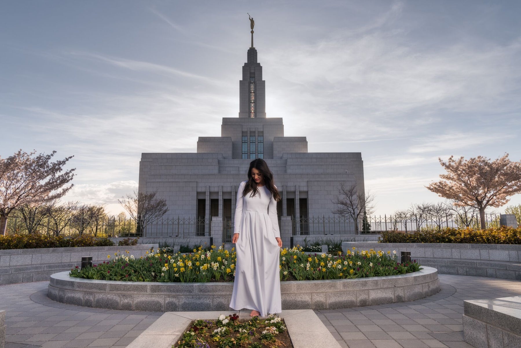 The Michelle features perfectly placed pleats that create a flattering A-line silhouette, gracefully skimming your figure while providing full coverage and easy movement. The modest rounded neckline and long sleeves meet temple standards beautifully, while hidden pockets add practical functionality – because even temple dresses deserve pockets! The premium double-knit fabric drapes elegantly without clinging, ensuring you feel confident and comfortable from ceremony to celebration.