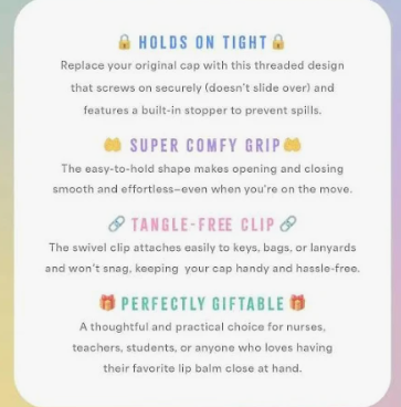 The Bubble Lip Keychain Cover transforms your favorite lip treatment into a convenient, travel-friendly accessory with a functional swivel keychain design. Perfect for on-the-go use, they easily attach to keys, purses, backpacks, or water bottles, ensuring your lip gloss or balm is always within reach. Designed for both style and practicality, these keychain caps make carrying your favorite lip product effortless and chic.