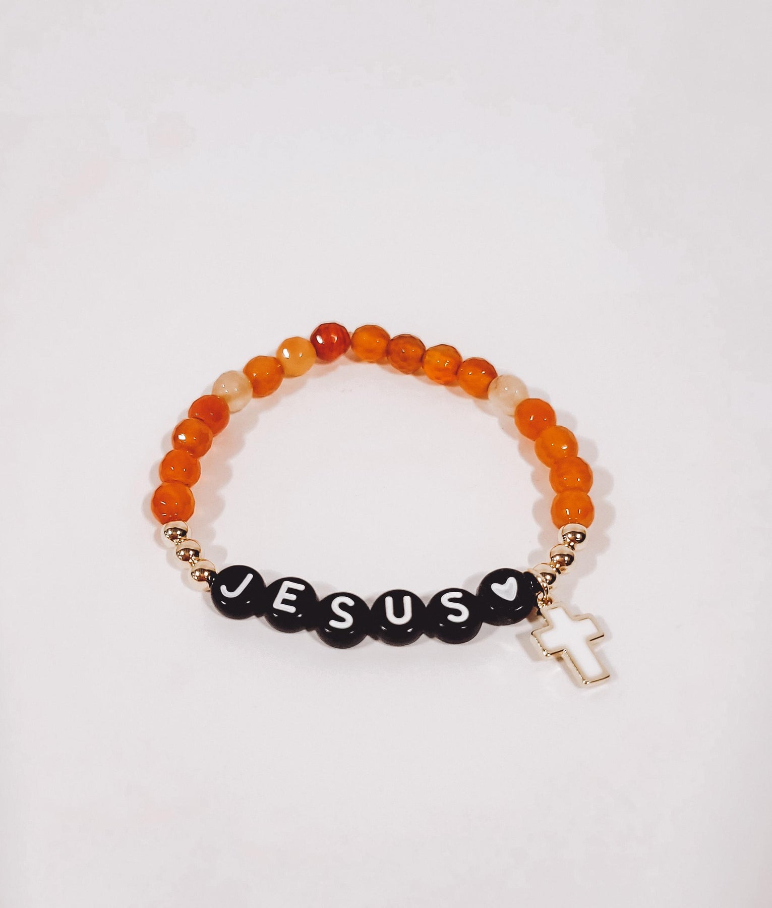 Embrace spiritual elegance with our Jesus Bracelets, crafted with rounded Carnelian Agate gemstones and accented with durable 14K gold filled spacers to ensure long-lasting shine. Designed to withstand daily wear, including in water, these bracelets feature stretchy elastic for easy wearability and comfort, serving as a meaningful reminder of faith that sparks conversations about Jesus wherever you go.