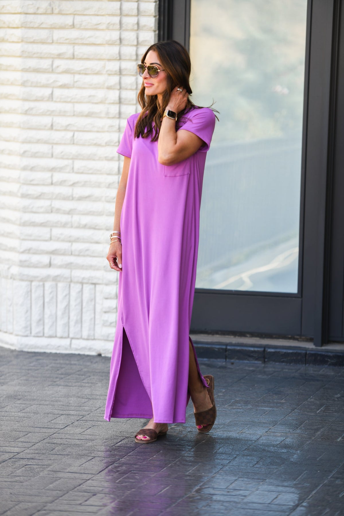 The Pocket Maxi is so versatile. Made of our popular wrinkle free fabric, it is ideal for travel and on-the-go. It features a round neck, short sleeves, pockets, and flattering side slits for un-restricted all day comfort. Side slits start below the knee.