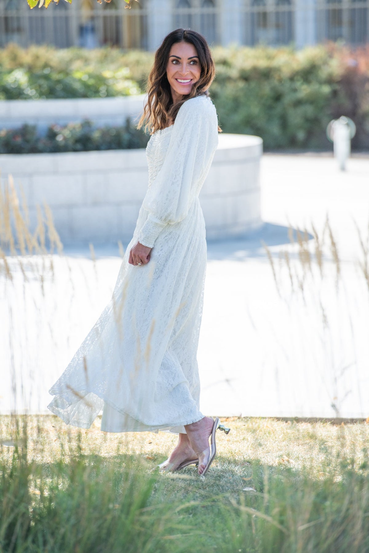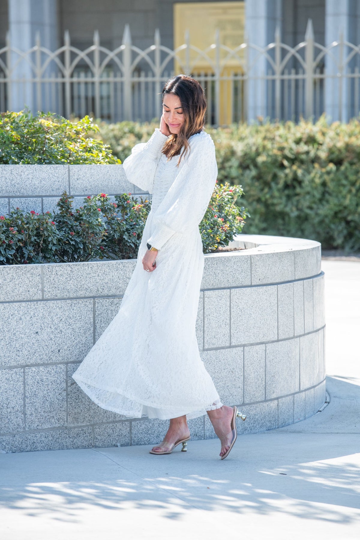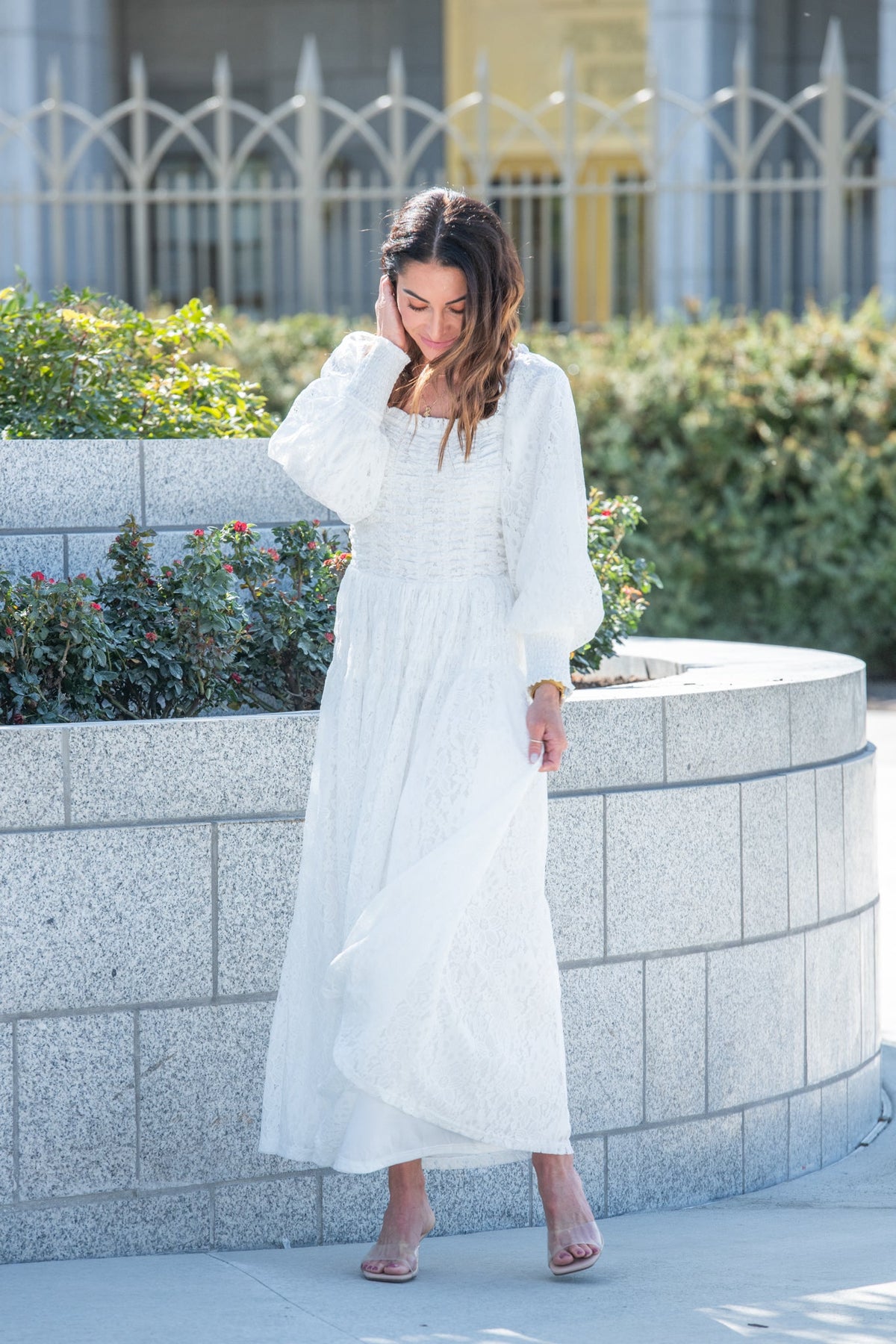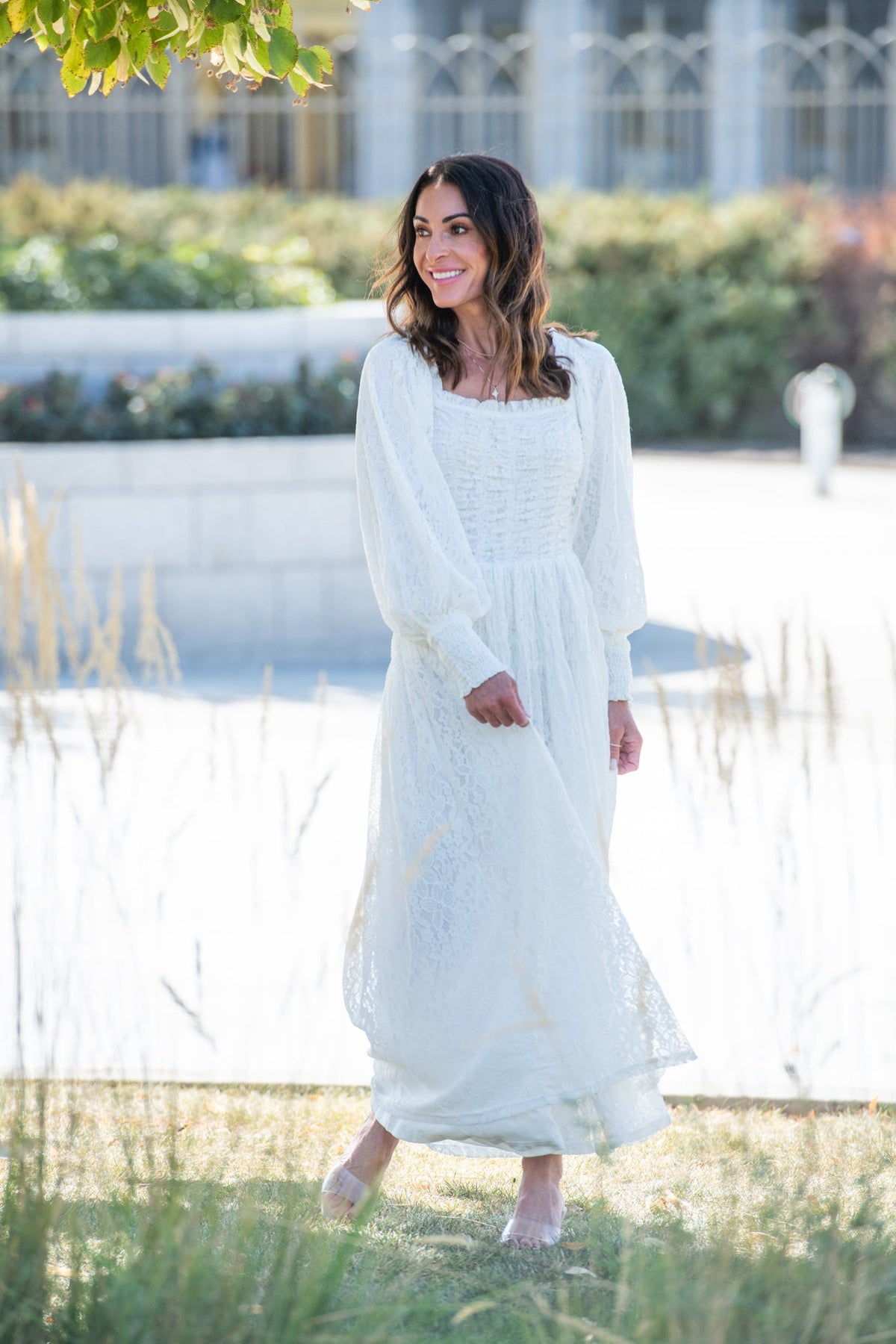 Every detail of the Presley has been carefully considered. The modest square neckline is beautifully framed with delicate lace trim, offering full coverage while adding vintage-inspired charm. Long sleeves with smocked cuffs provide elegant arm coverage, and the fully lined maxi-length skirt ensures complete opacity and peace of mind. The all-white design meets temple standards while the romantic lace elevates this dress beyond the ordinary.