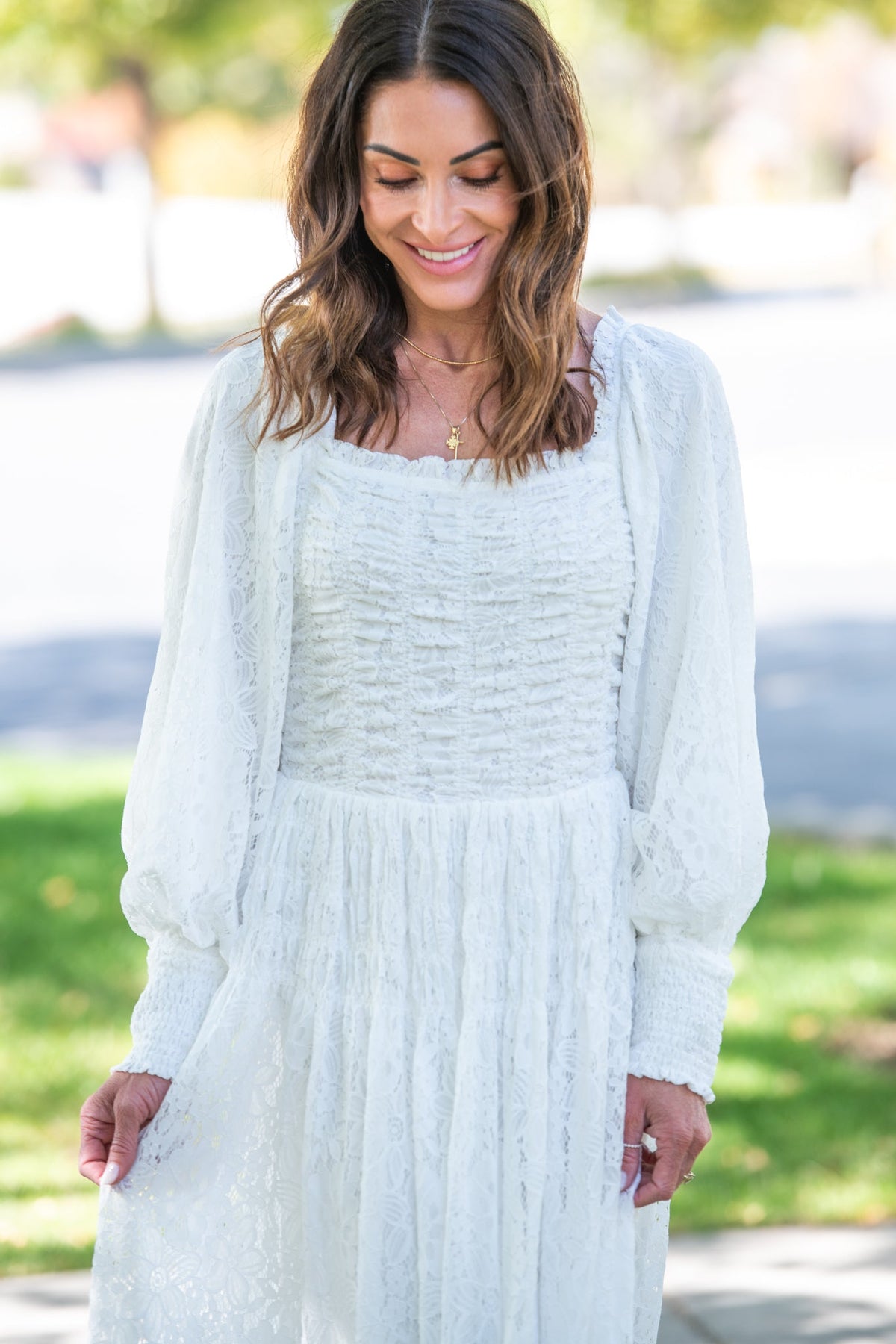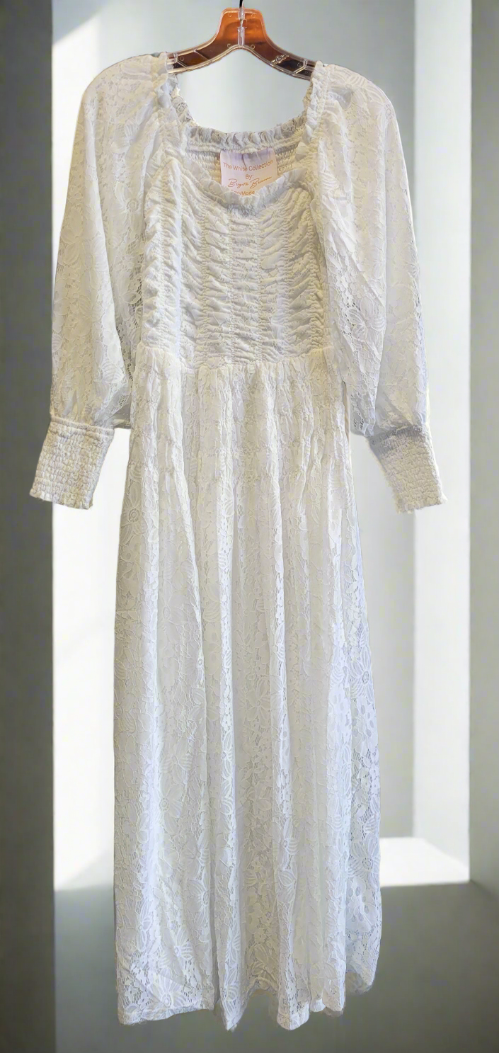 Experience timeless elegance with the Presley, a breathtaking temple-ready dress designed for your most sacred moments. This romantic white maxi features intricate lace detailing throughout, creating an ethereal look that's both modest and magnificent. The soft smocked bodice provides a comfortable, flattering fit.